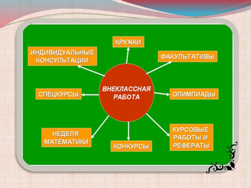 Она отличается от учебной деятельности, прежде всего тем, что не является обязательной. Здесь используются самые увлекательные коллективные дела: игры, конкурсы, состязания эрудитов, математические вечера, КВНы.