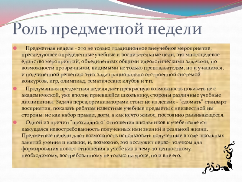 Одной из причин "прохладного" отношения школьников к учебе является кажущаяся невостребованность полученных ими знаний в реальной жизни. Предметные недели дают возможность использовать полученные в ходе школьных занятий умения и навыки, и, возможно, это послужит перво- толчком для формирования нового отношения к учебе как к чему-то ценностному, необходимому, востребованному не только на уроке, но и вне его.