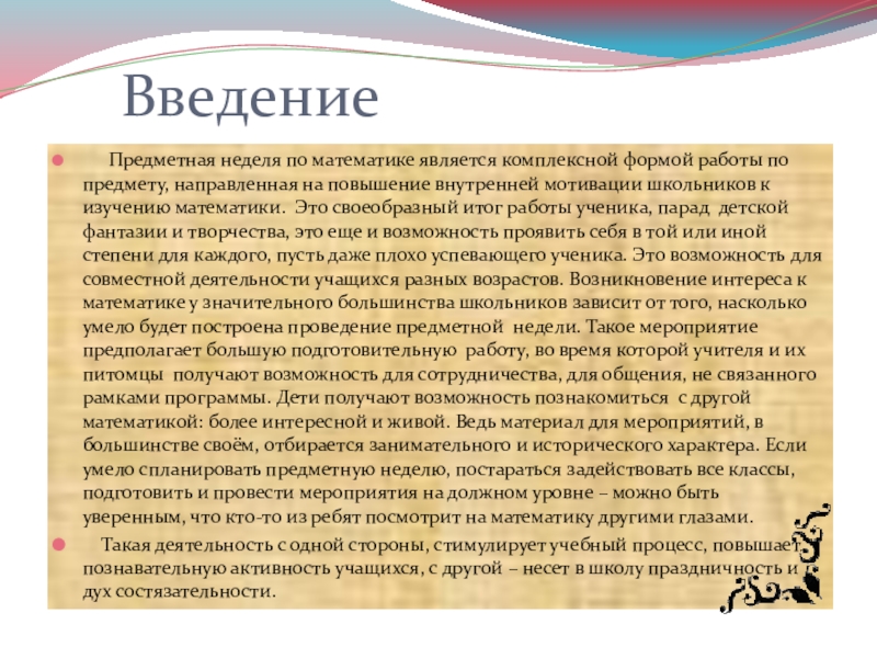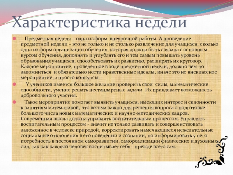 комплексной формой работы по предмету, направленная на повышение внутренней мотивации школьников к изучению математики. Это своеобразный итог работы ученика, парад детской фантазии и творчества, это еще и возможность проявить себя в той или иной степени для каждого, пусть даже плохо успевающего ученика. Это возможность для совместной деятельности учащихся разных возрастов. Возникновение интереса к математике у значительного большинства школьников зависит от того, насколько умело будет построена проведение предметной недели. Такое мероприятие предполагает большую подготовительную работу, во время которой учителя и их питомцы получают возможность для сотрудничества, для общения, не связанного рамками программы. Дети получают возможность познакомиться с другой математикой: более интересной и живой. Ведь материал для мероприятий, в большинстве своём, отбирается занимательного и исторического характера. Если умело спланировать предметную неделю, постараться задействовать все классы, подготовить и провести мероприятия на должном уровне – можно быть уверенным, что кто-то из ребят посмотрит на математику другими глазами.