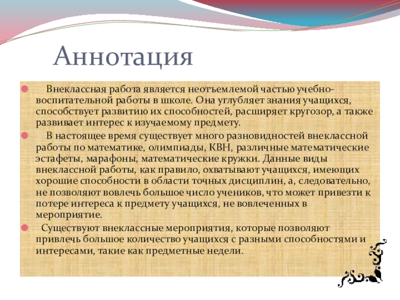 Она углубляет знания учащихся, способствует развитию их способностей, расширяет кругозор, а также развивает интерес к изучаемому предмету.