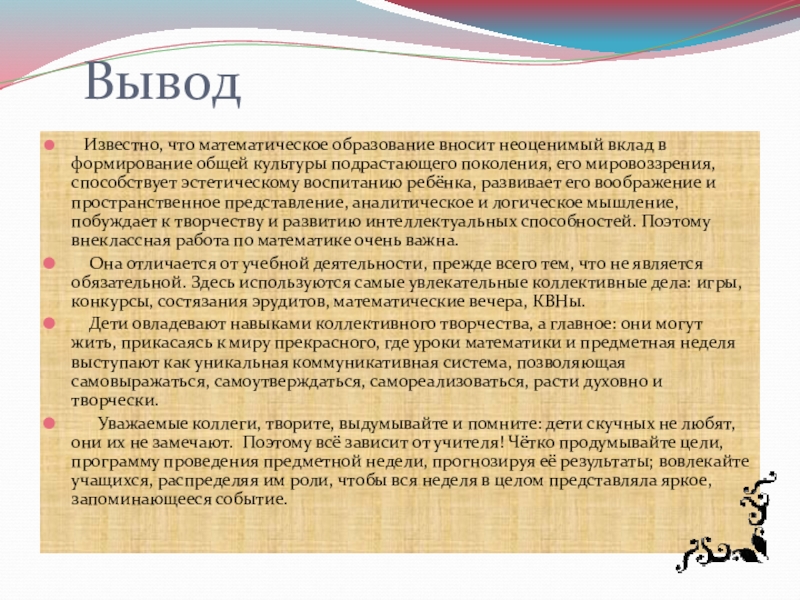 в формирование общей культуры подрастающего поколения, его мировоззрения, способствует эстетическому воспитанию ребёнка, развивает его воображение и пространственное представление, аналитическое и логическое мышление, побуждает к творчеству и развитию интеллектуальных способностей. Поэтому внеклассная работа по математике очень важна.
