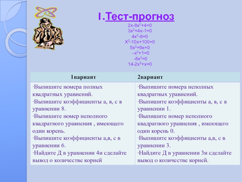 1.Найдите коэффициенты квадратного уравнения 2х2+5х-7=0 Зх2 – 6х - 9 = 0
