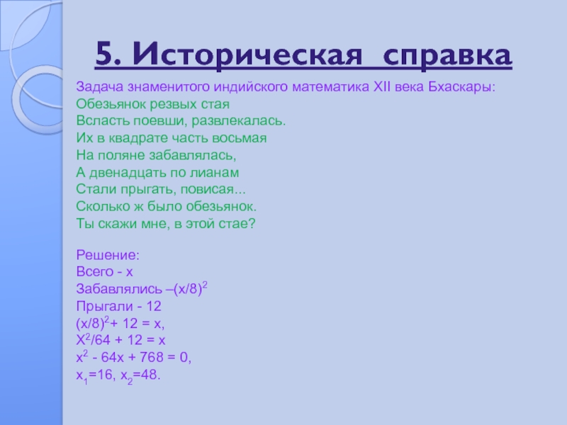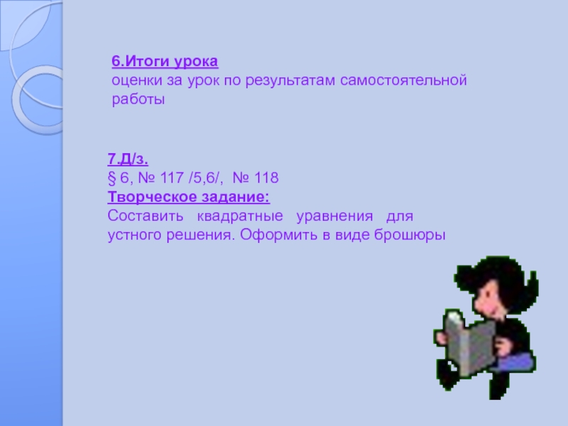 Составить квадратные уравнения для устного решения. Оформить в виде брошюры