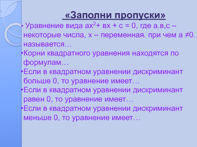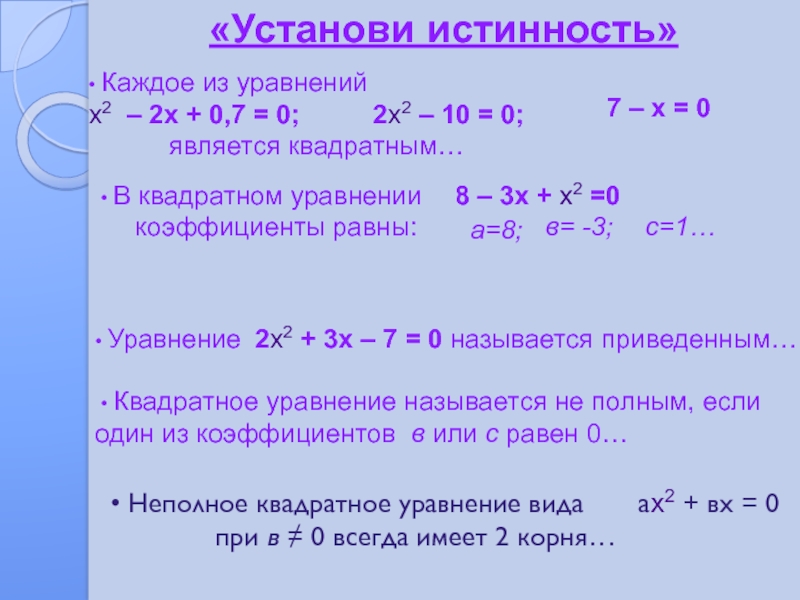 • Квадратное уравнение называется не полным, если один из коэффициентов в или с равен 0…