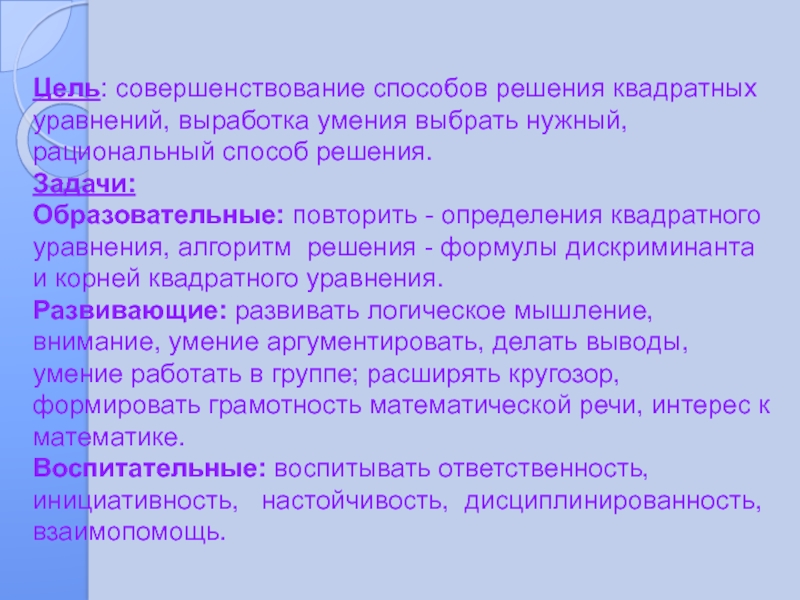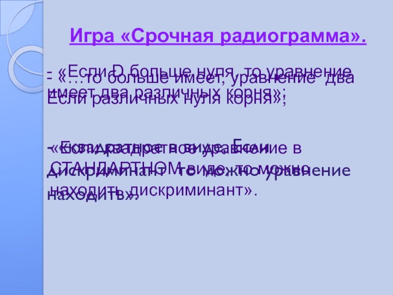 - «Если D больше нуля, то уравнение имеет два различных корня»;