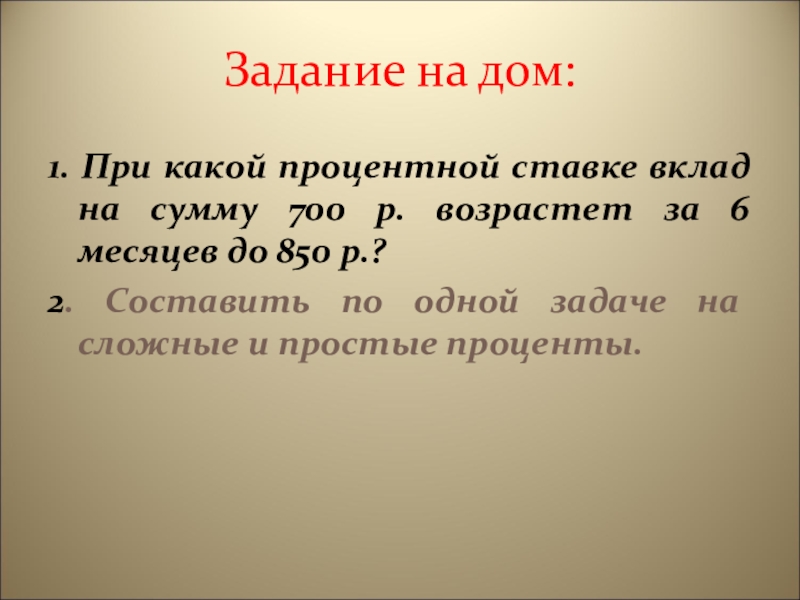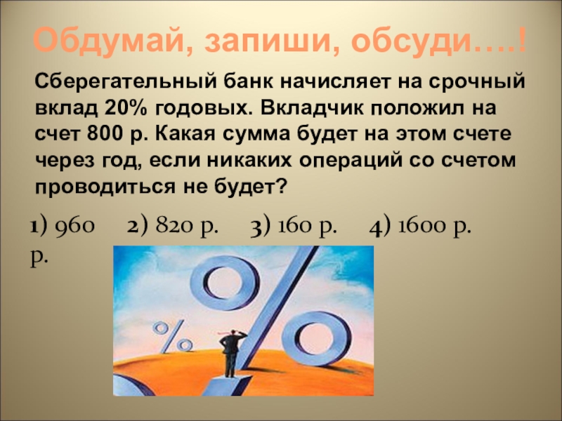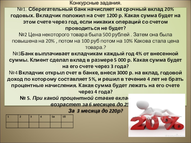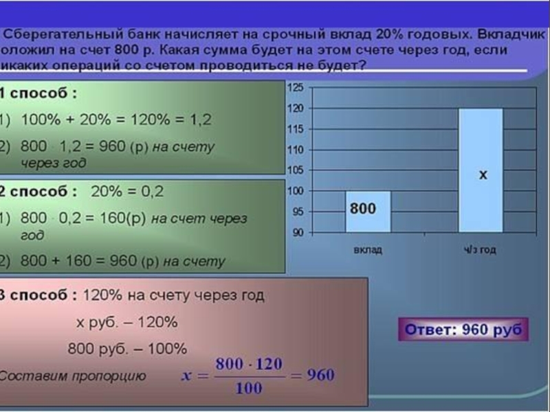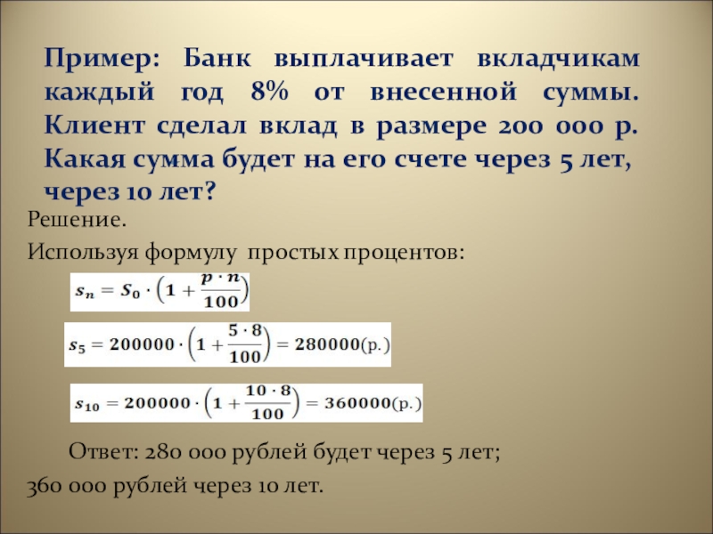 Пример: Банк выплачивает вкладчикам каждый год 8% от внесенной суммы. Клиент сделал вклад в размере 200 000 р. Какая сумма будет на его счете через 5 лет, через 10 лет?