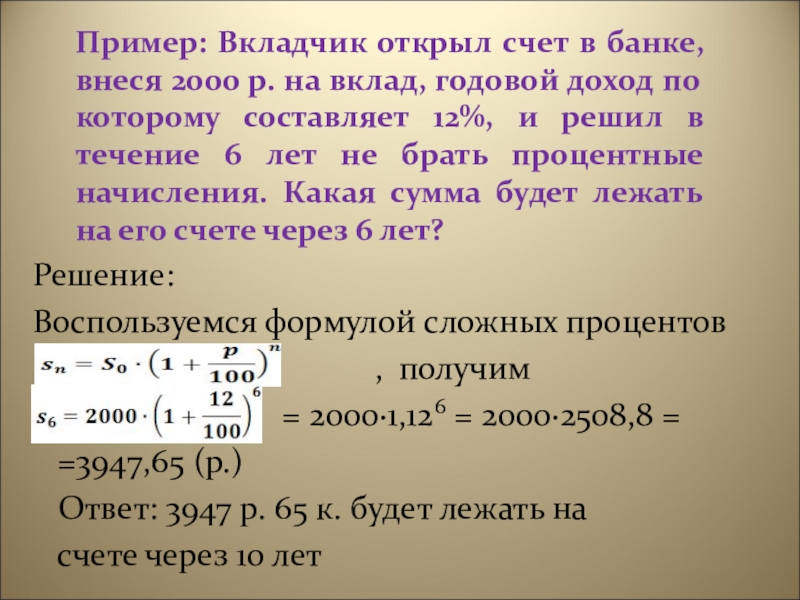 Пример: Вкладчик открыл счет в банке, внеся 2000 р. на вклад, годовой доход по которому составляет 12%, и решил в течение 6 лет не брать процентные начисления. Какая сумма будет лежать на его счете через 6 лет?