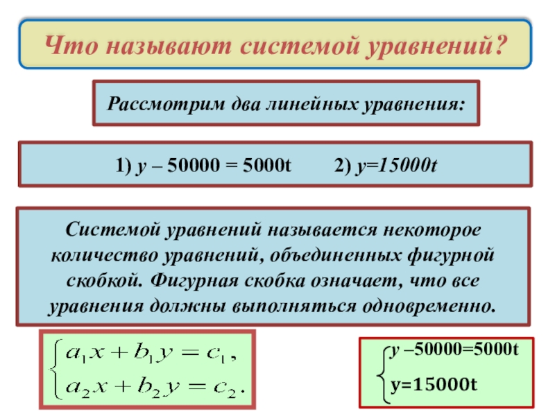 Системой уравнений называется некоторое количество уравнений, объединенных фигурной скобкой. Фигурная скобка означает, что все уравнения должны выполняться одновременно.