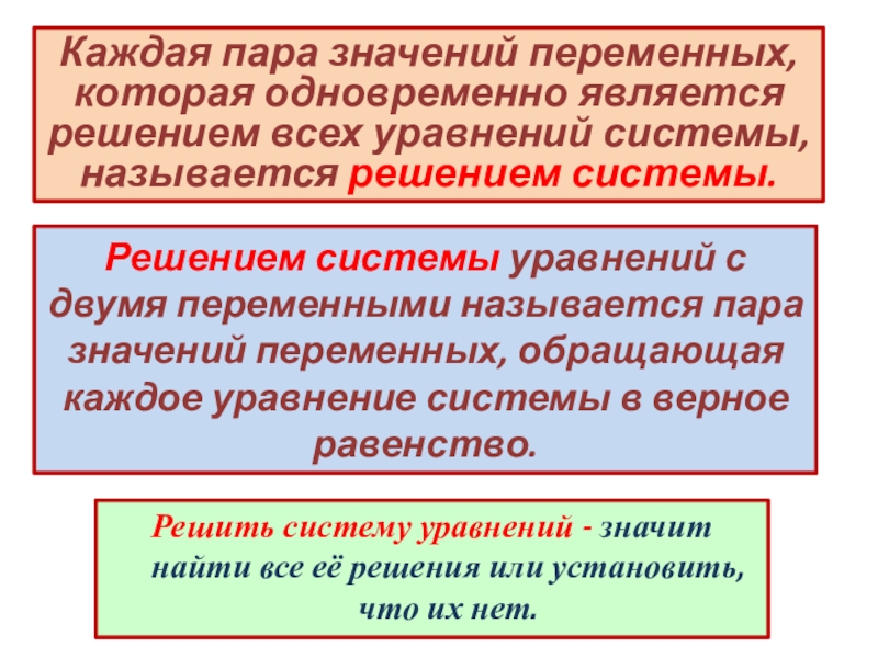 Решением системы уравнений с двумя переменными называется пара значений переменных, обращающая каждое уравнение системы в верное равенство.