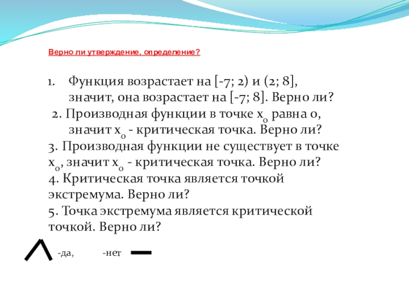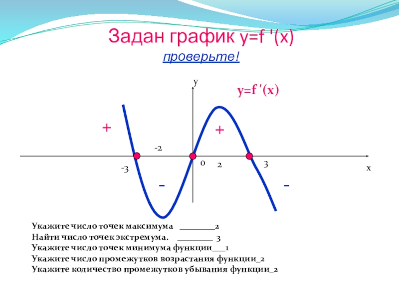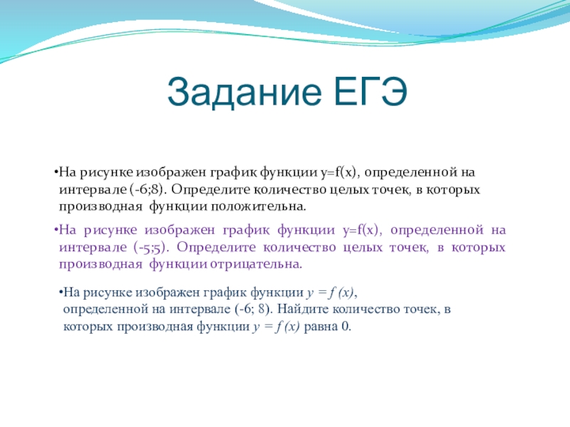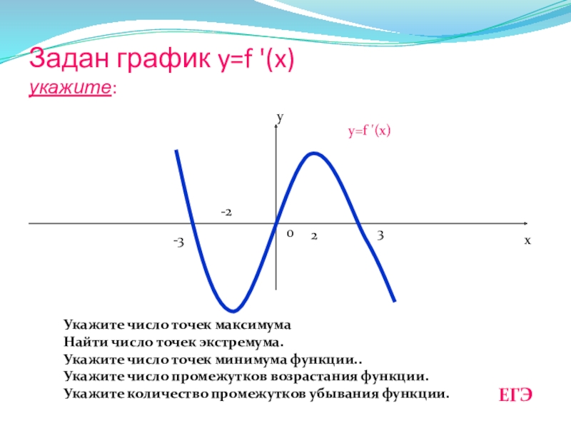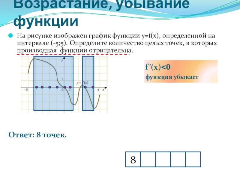 На рисунке изображен график функции у=f(x), определенной на интервале (-5;5). Определите количество целых точек, в которых производная функции отрицательна.