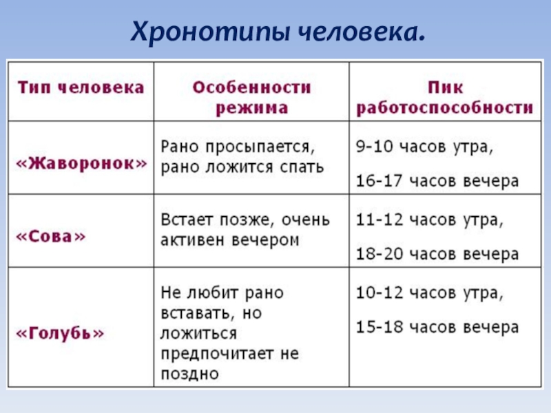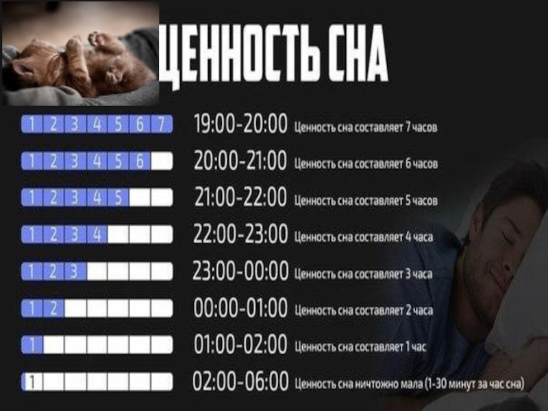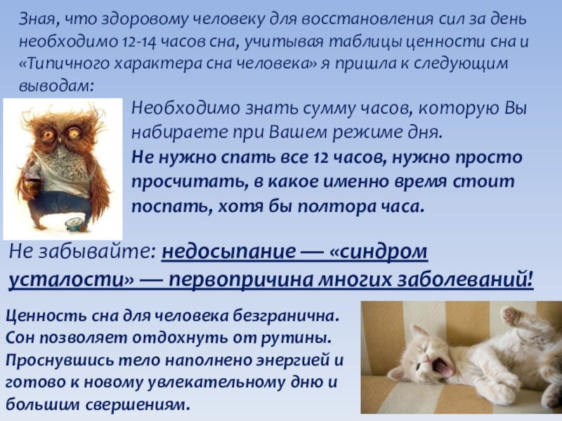 Зная, что здоровому человеку для восстановления сил за день необходимо 12-14 часов сна, учитывая таблицы ценности сна и «Типичного характера сна человека» я пришла к следующим выводам: