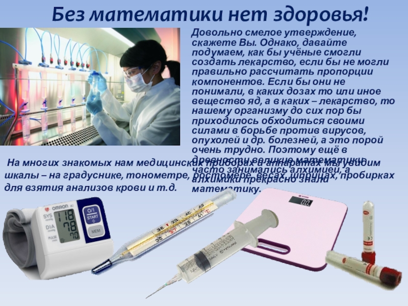 На многих знакомых нам медицинских приборах и аппаратах мы увидим шкалы – на градуснике, тонометре, ростомере, весах, шприцах, пробирках для взятия анализов крови и т.д.