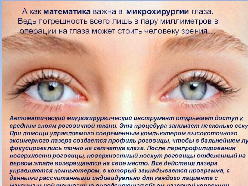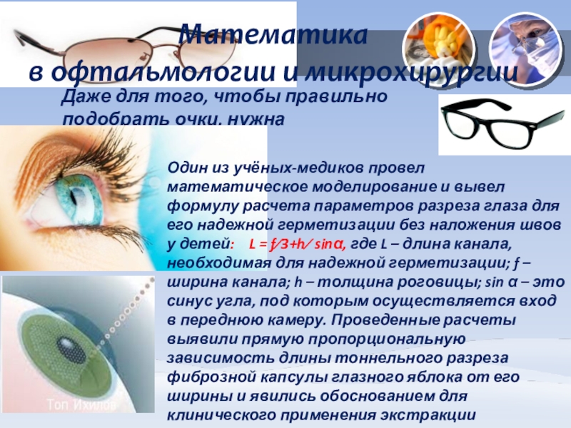 Один из учёных-медиков провел математическое моделирование и вывел формулу расчета параметров разреза глаза для его надежной герметизации без наложения швов у детей: L = f⁄3+h⁄ sinα, где L – длина канала, необходимая для надежной герметизации; f – ширина канала; h – толщина роговицы; sin α – это синус угла, под которым осуществляется вход в переднюю камеру. Проведенные расчеты выявили прямую пропорциональную зависимость длины тоннельного разреза фиброзной капсулы глазного яблока от его ширины и явились обоснованием для клинического применения экстракции катаракты и имплантации интраокулярных линз у детей через тоннельный разрез без наложения швов.