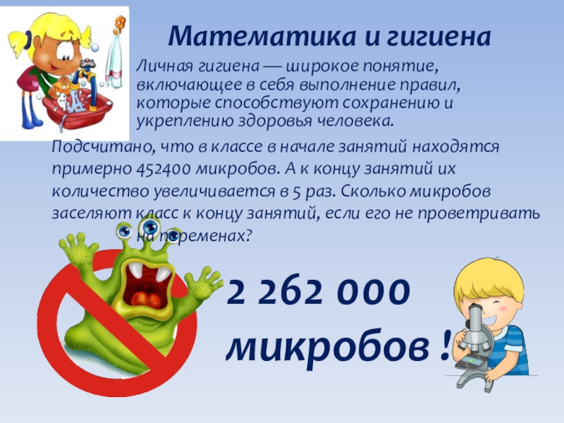 Подсчитано, что в классе в начале занятий находятся примерно 452400 микробов. А к концу занятий их количество увеличивается в 5 раз. Сколько микробов заселяют класс к концу занятий, если его не проветривать на переменах?