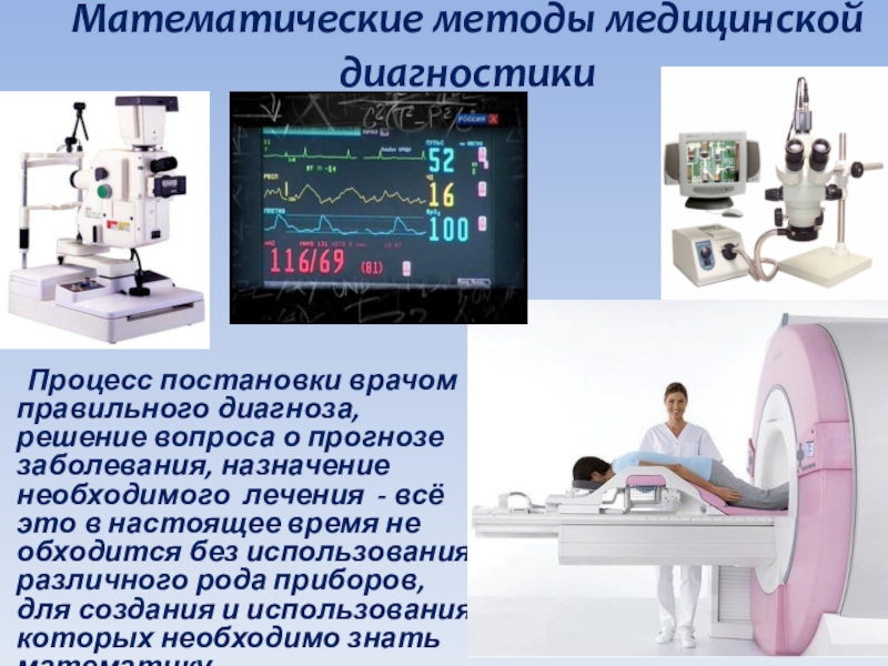 Процесс постановки врачом правильного диагноза, решение вопроса о прогнозе заболевания, назначение необходимого лечения - всё это в настоящее время не обходится без использования различного рода приборов, для создания и использования которых необходимо знать математику…