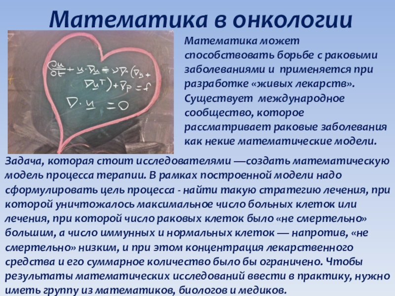 Задача, которая стоит исследователями —создать математическую модель процесса терапии. В рамках построенной модели надо сформулировать цель процесса - найти такую стратегию лечения, при которой уничтожалось максимальное число больных клеток или лечения, при которой число раковых клеток было «не смертельно» большим, а число иммунных и нормальных клеток — напротив, «не смертельно» низким, и при этом концентрация лекарственного средства и его суммарное количество было бы ограничено. Чтобы результаты математических исследований ввести в практику, нужно иметь группу из математиков, биологов и медиков.
