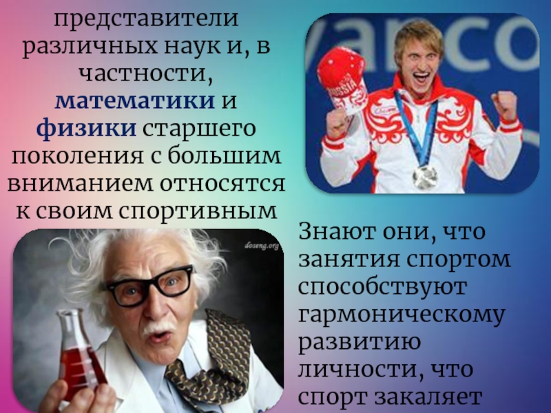 Знают они, что занятия спортом способствуют гармоническому развитию личности, что спорт закаляет человека физически и духовно.
