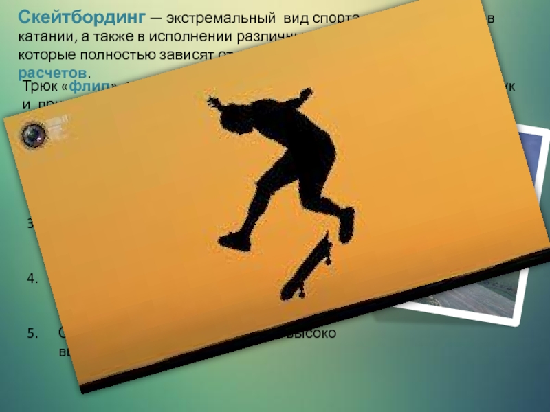 Трюк «флип», заключается в поднятии доски в воздух без помощи рук и приданию ей вращения в одной или нескольких плоскостях,