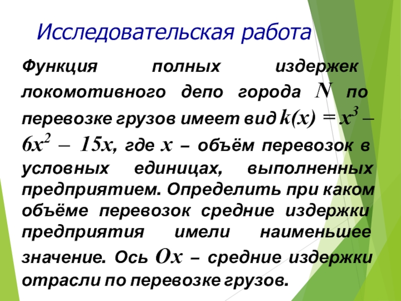 имеет вид k(x) = x3 – 6x2 – 15x, где x – объём перевозок в условных единицах, выполненных предприятием. Определить при каком объёме перевозок средние издержки предприятия имели наименьшее значение. Ось Ох – средние издержки отрасли по перевозке грузов.
