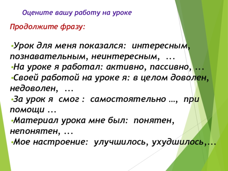 Своей работой на уроке я: в целом доволен, недоволен, ...