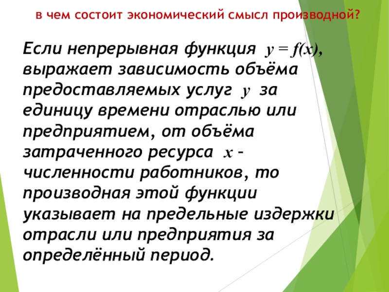выражает зависимость объёма предоставляемых услуг y за единицу времени отраслью или предприятием, от объёма затраченного ресурса x – численности работников, то производная этой функции указывает на предельные издержки отрасли или предприятия за определённый период.