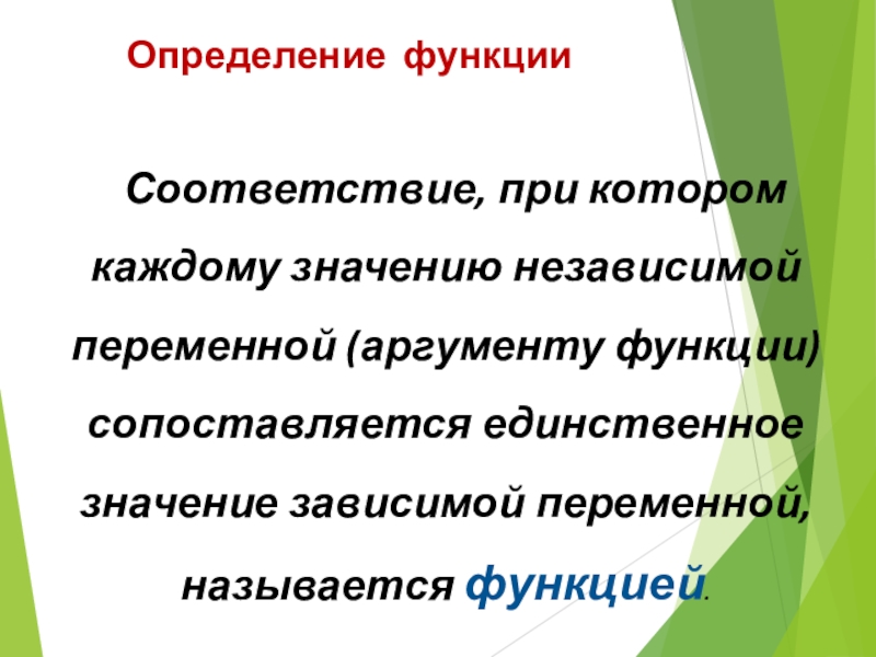 (аргументу функции) сопоставляется единственное значение зависимой переменной, называется функцией.