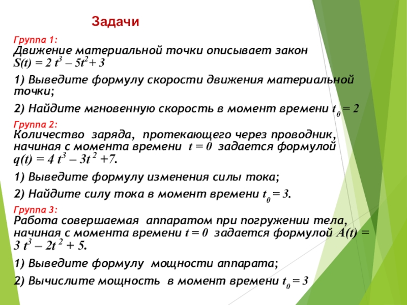 S(t) – закон движения материальной точки за время t, (путь S – в метрах, время t – в секундах). Производная от пути по времени, есть средняя скорость движения материальной точки: V(t) = S′(t)