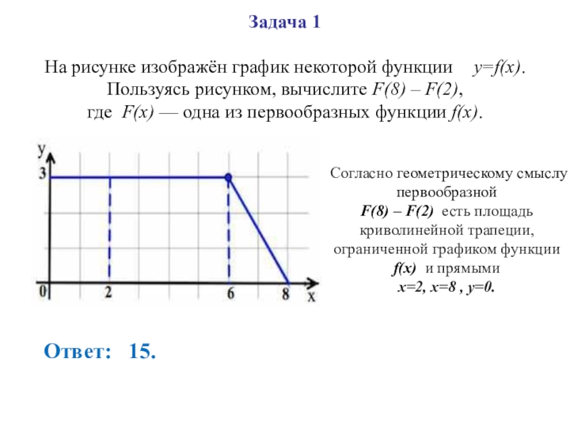 F(8) – F(2) есть площадь криволинейной трапеции, ограниченной графиком функции f(x) и прямыми