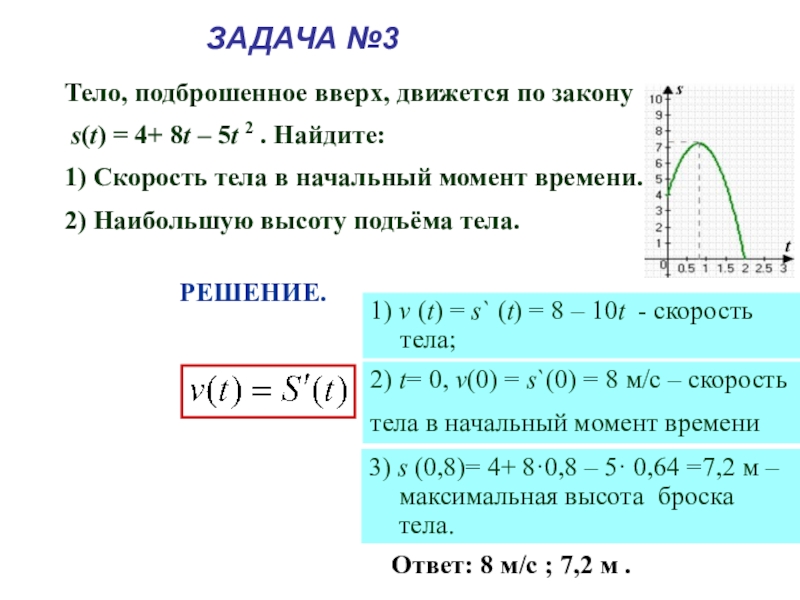 3) s (0,8)= 4+ 8·0,8 – 5· 0,64 =7,2 м – максимальная высота броска тела.