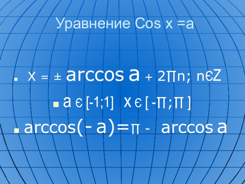 Уравнение Cos x =a X = ± arccos a + 2∏n; nЄZa Є [-1;1]  x Є