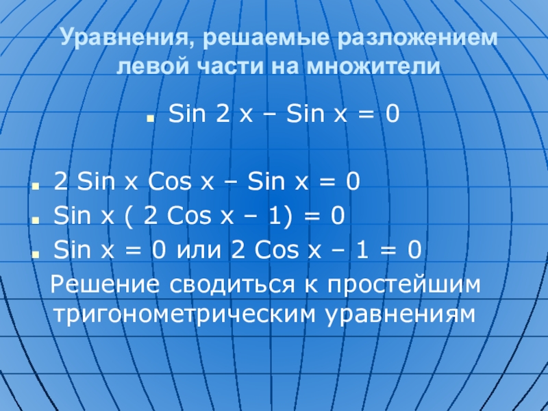 Уравнения, решаемые разложением левой части на множителиSin 2 x – Sin x = 02 Sin x Cos