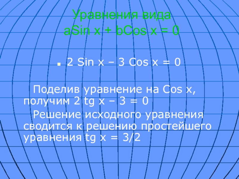 Слайд 8Уравнения вида aSin x + bCos x = 0
