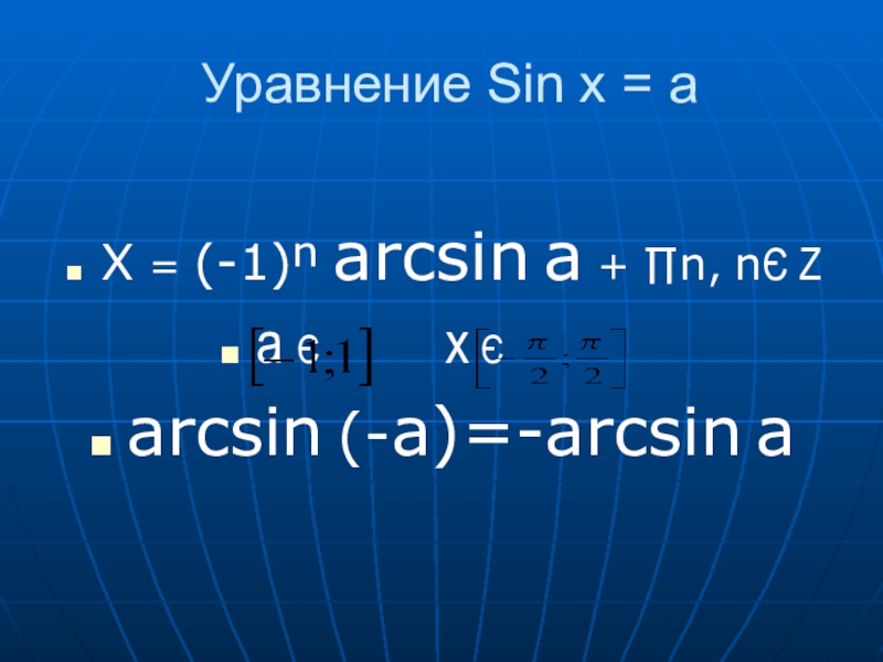 Уравнение Sin x = aX = (-1)ⁿ arcsin a + ∏n, nЄ Za Є x Є arcsin (-a)=-arcsin a