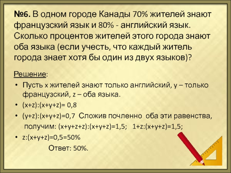Пусть x жителей знают только английский, y – только французский, z – оба языка.