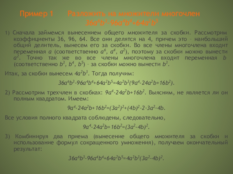 1) Сначала займемся вынесением общего множителя за скобки. Рассмотрим коэффициенты 36, 96, 64. Все они делятся на 4, причем это – наибольший общий делитель, вынесем его за скобки. Во все члены многочлена входит переменная a (соответственно a6, a4, a2), поэтому за скобки можно вынести a2. Точно так же во все члены многочлена входит переменная b (соответственно b3, b4, b5) – за скобки можно вынести b3.