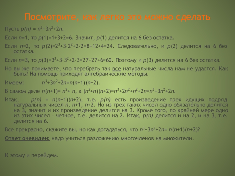 Итак, p(n) = n(n+1)(n+2), т.е. p(n) есть произведение трех идущих подряд натуральных чисел n, n+1, n+2. Но из трех таких чисел одно обязательно делится на 3, значит и их произведение делится на 3. Кроме того, по крайней мере одно из этих чисел – четное, т.е. делится на 2. Итак, p(n) делится и на 2, и на 3, т.е. делится на 6.
