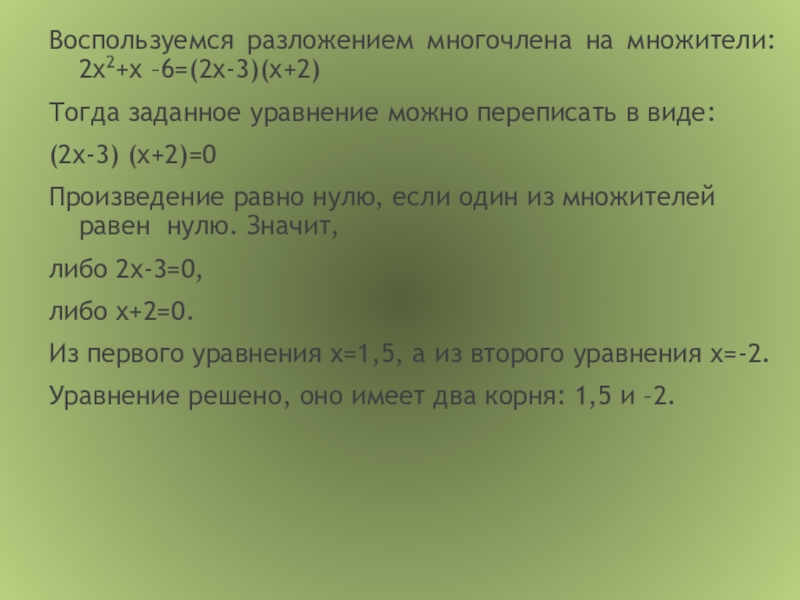 Слайд 4Воспользуемся разложением многочлена на множители: 2х2+х –6=(2х-3)(х+2)