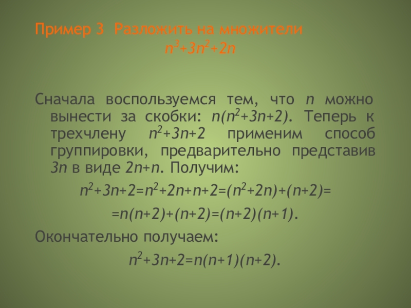 Сначала воспользуемся тем, что n можно вынести за скобки: n(n2+3n+2). Теперь к трехчлену n2+3n+2 применим способ группировки, предварительно представив 3n в виде 2n+n. Получим: