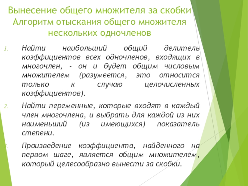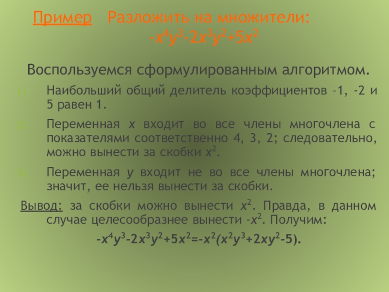 Найти переменные, которые входят в каждый член многочлена, и выбрать для каждой из них наименьший (из имеющихся) показатель степени.