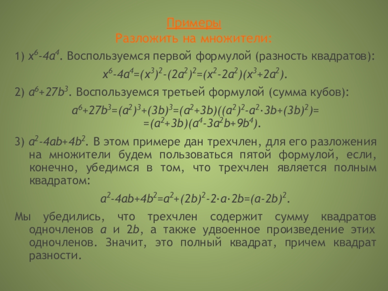 из этих формул можно применять к выражению, представляющему собой разность квадратов (безразлично чего – чисел, одночленов, многочленов), вторую и третью – к выражению, представляющему собой разность (или сумму) кубов; последние две формулы применяются к трехчлену, представляющему собой полный квадрат, т.е. содержащему сумму квадратов двух выражений и удвоенное произведение тех же выражений.
