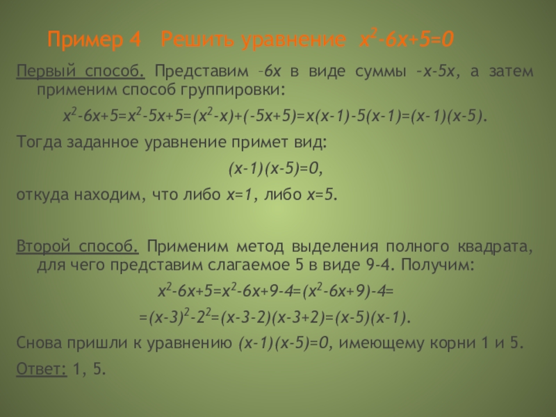 Слайд 18Пример 4 Решить уравнение x2-6x+5=0