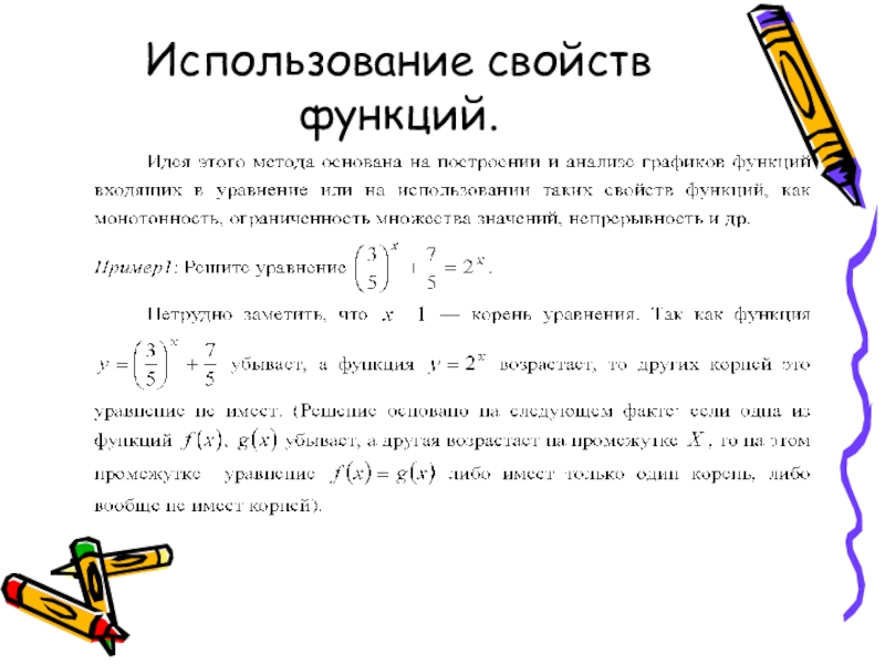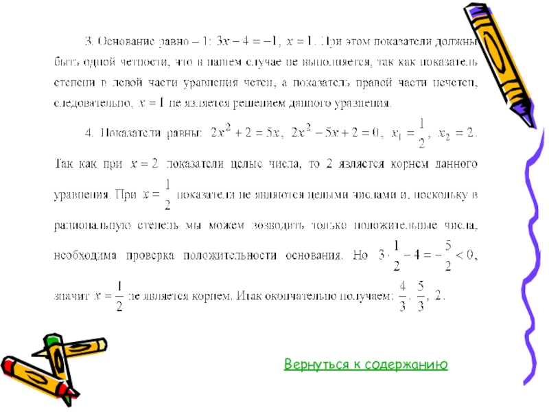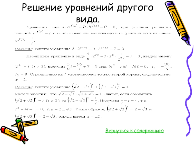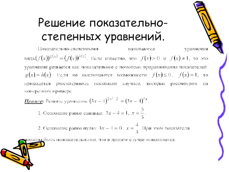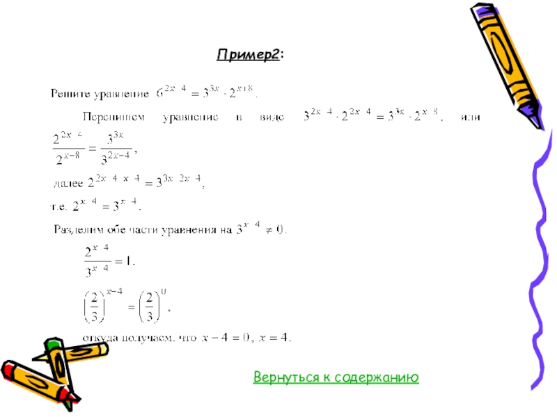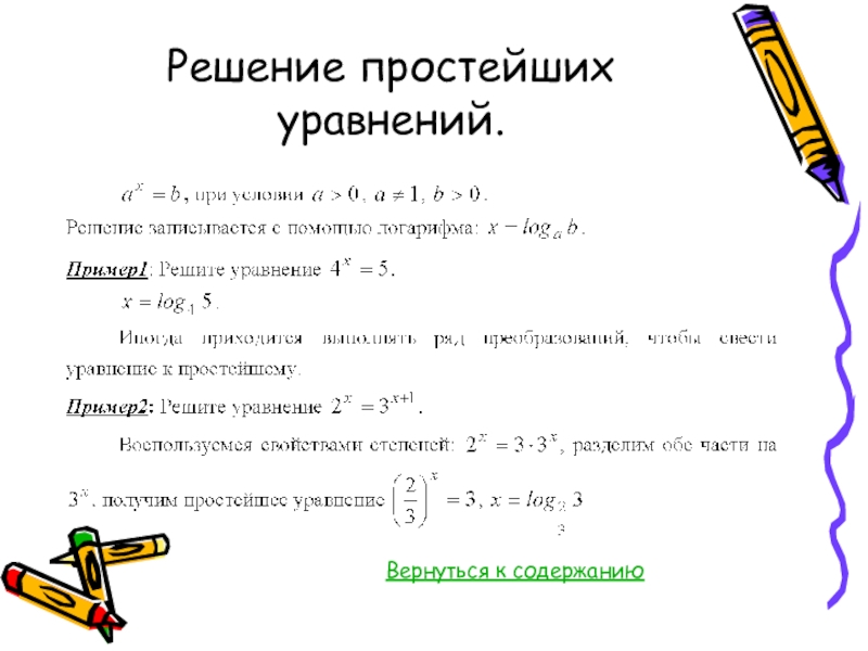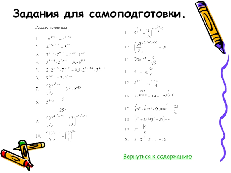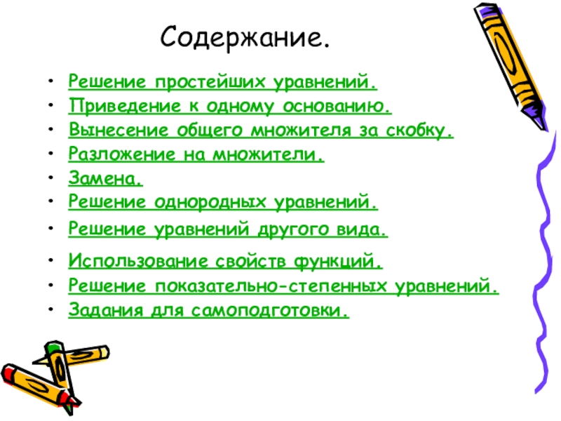 Содержание.Решение простейших уравнений.Приведение к одному основанию. Вынесение общего множителя за скобку. Разложение на множители. Замена. Решение однородных уравнений. Решение уравнений другого вида. Использование свойств функций. Решение показательно-степенных уравнений.Задания для самоподготовки.