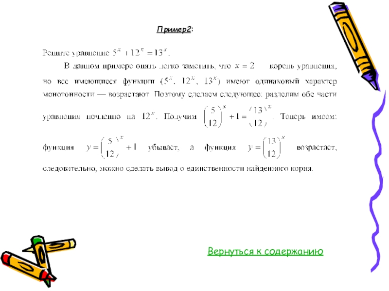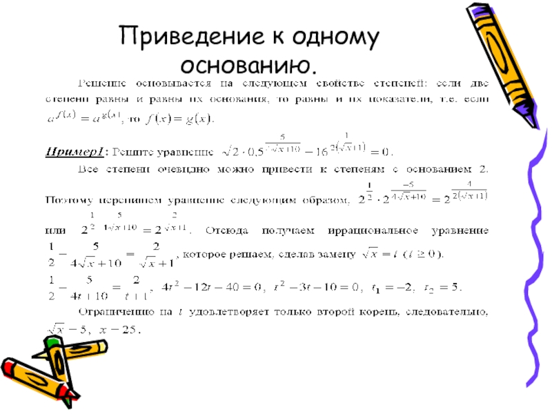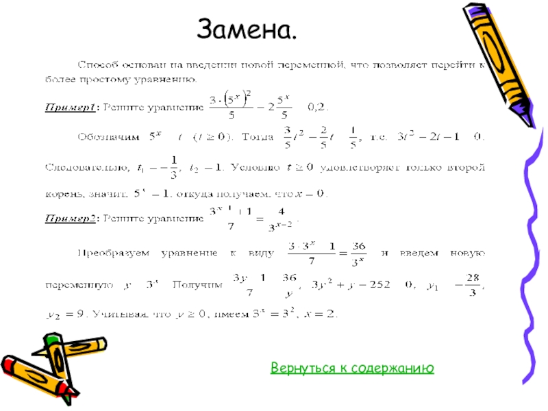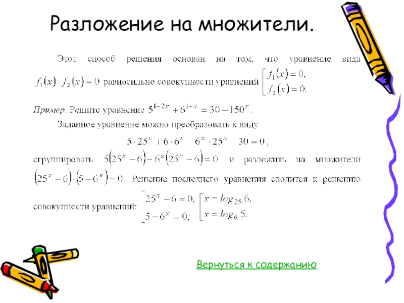 Содержание.Решение простейших уравнений.Приведение к одному основанию. Вынесение общего множителя за скобку. Разложение на множители. Замена. Решение однородных