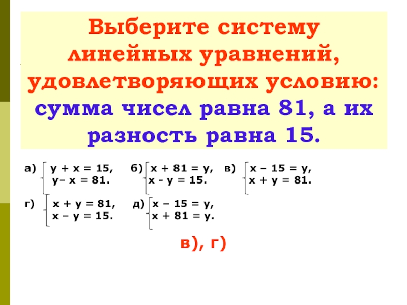 а) у + х = 15, б) х + 81 = у, в) х – 15 = у,