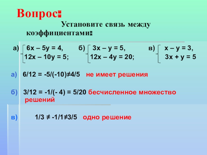 б) 3/12 = -1/(- 4) = 5/20 бесчисленное множество решений
