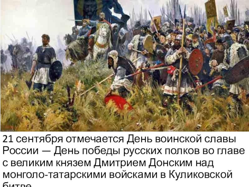 21 сентября отмечается День воинской славы России — День победы русских полков во главе с великим князем Дмитрием Донским над монголо-татарскими войсками в Куликовской битве