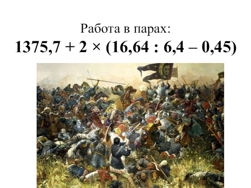 Слайд 3Работа в парах: 1375,7 + 2 × (16,64 : 6,4 – 0,45)