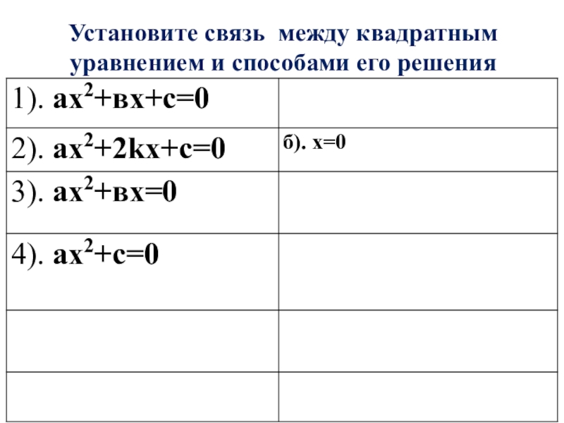 Слайд 4Установите связь между квадратным уравнением и способами его решения
