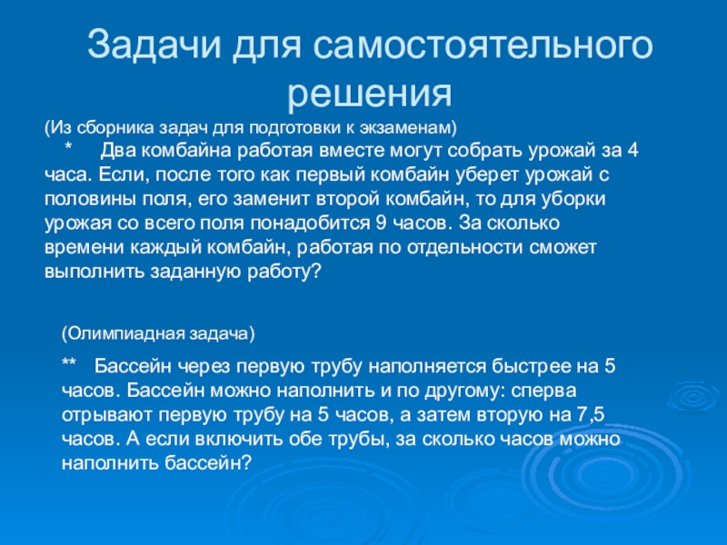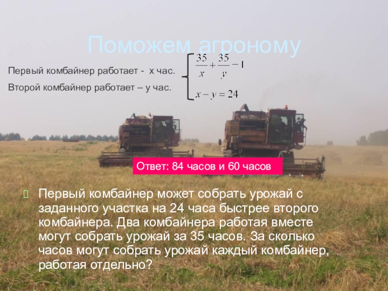 * Два комбайна работая вместе могут собрать урожай за 4 часа. Если, после того как первый комбайн уберет урожай с половины поля, его заменит второй комбайн, то для уборки урожая со всего поля понадобится 9 часов. За сколько времени каждый комбайн, работая по отдельности сможет выполнить заданную работу?