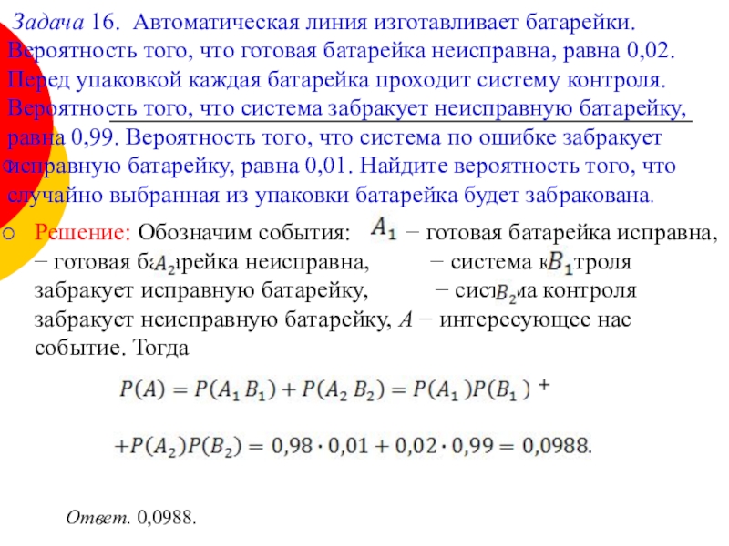 Решение. Пусть вероятность того, что нужный товар доставят из магазина А, вероятность того, что нужный товар доставят из магазина B. Тогда вероятность интересующего нас события будет равна (1 - )(1 - )= 0,2∙ 0,12 = 0, 024.